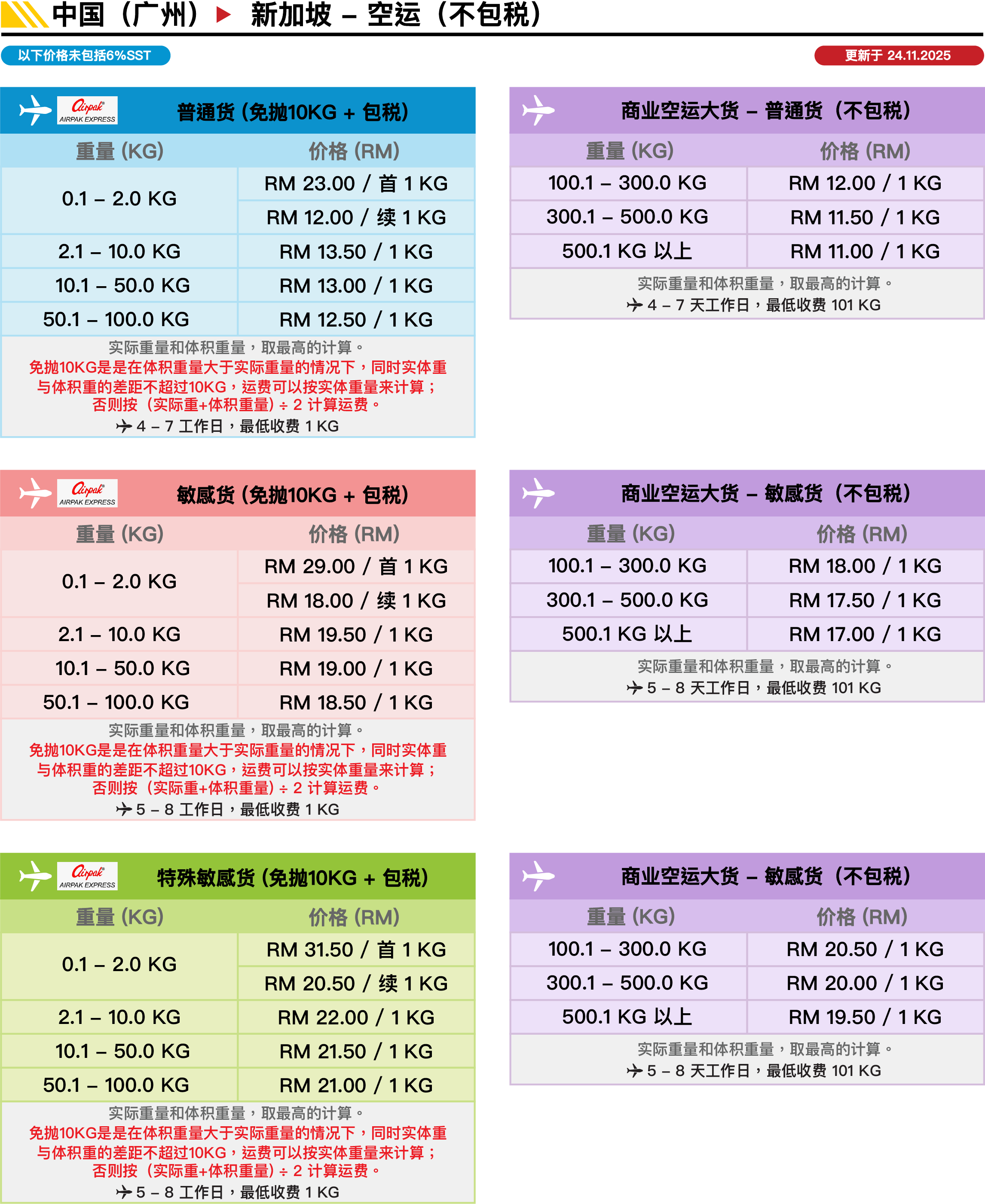 注意事项 - 中国到新加坡 (空运)