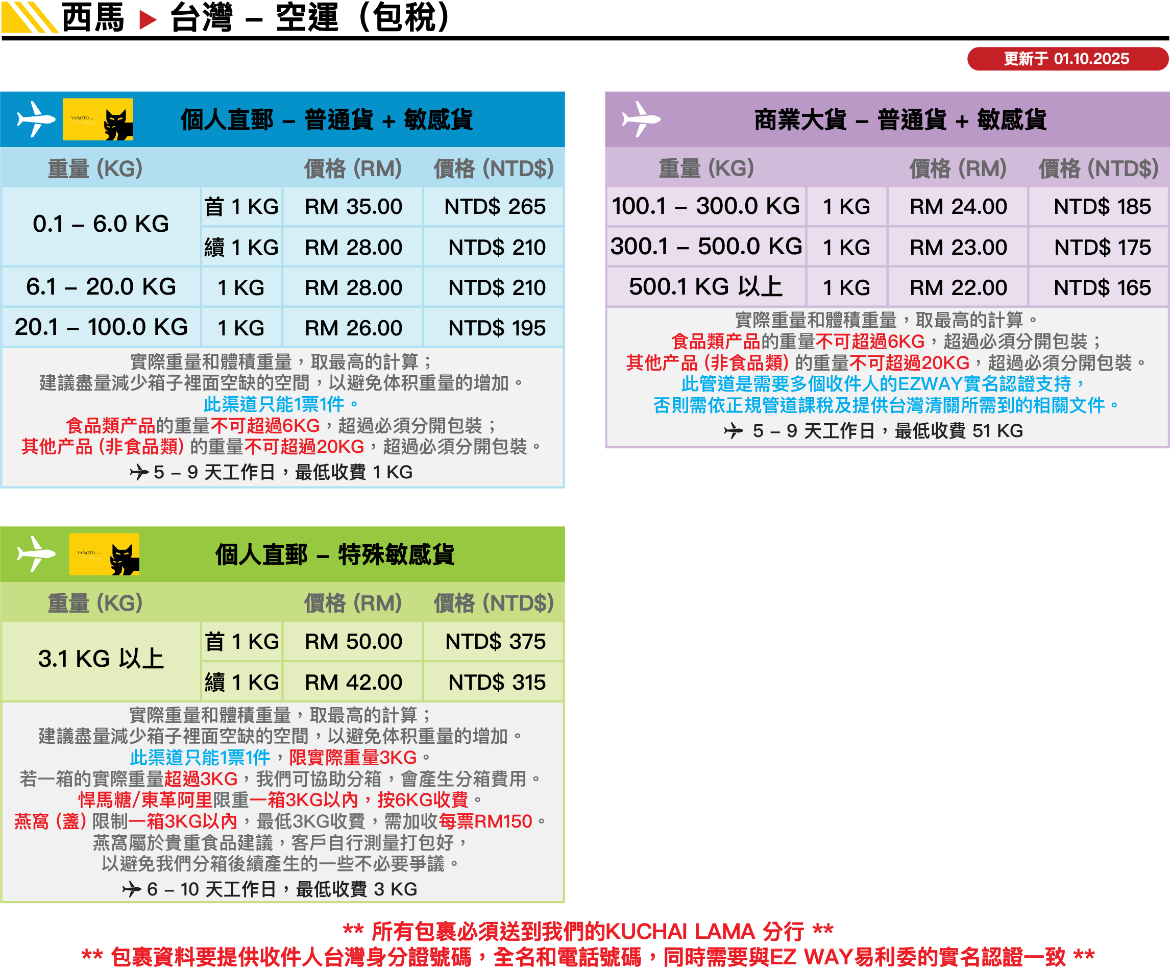 注意事项 - 马来西亚到台湾 (空运)