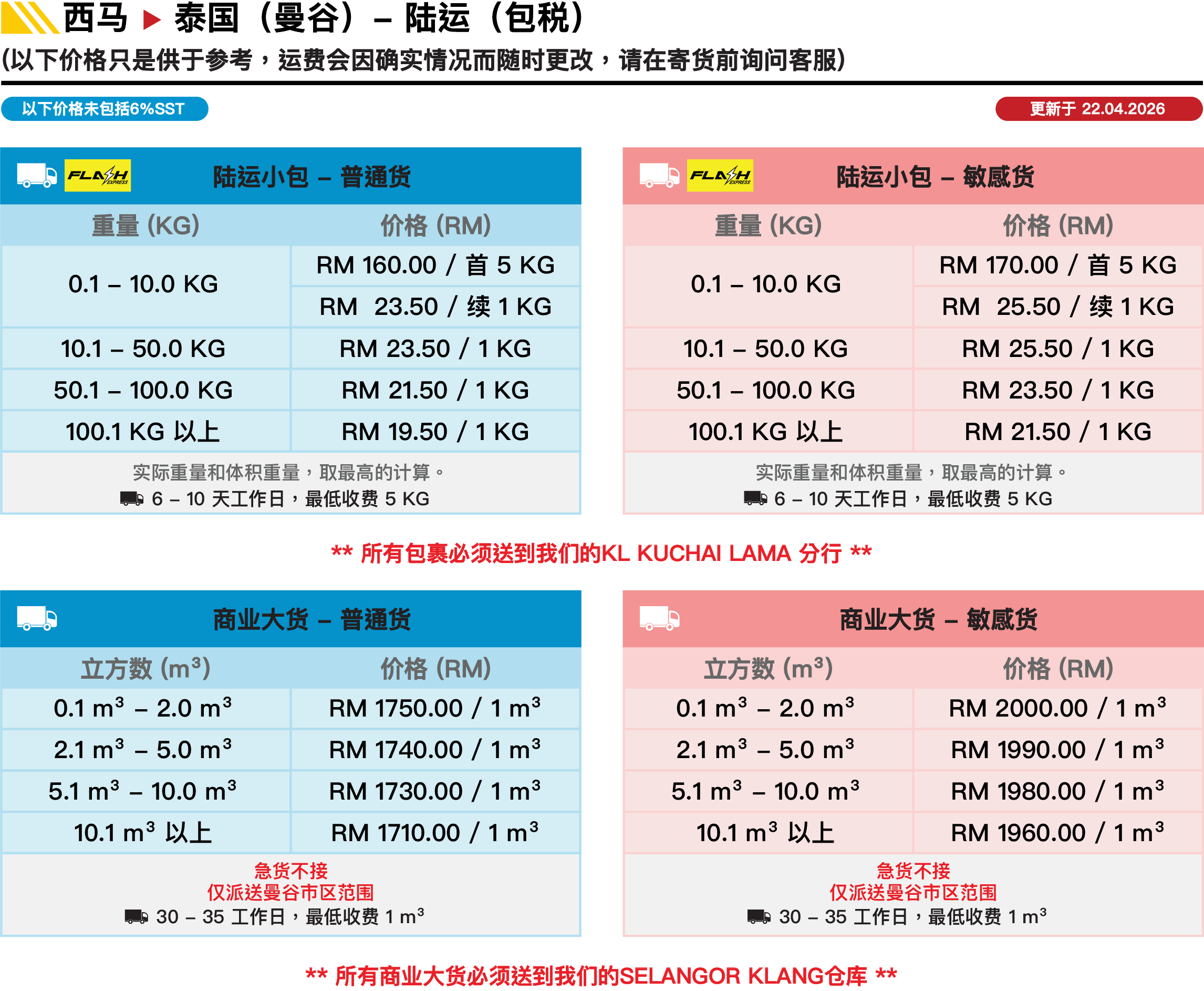 注意事项 - 西马到泰国 (陆运)